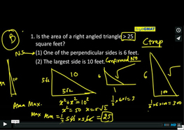 1. Is the area of a right angled triangle greater than 25 square feet?(1) One of the perpendicular sides is 6 feet. (2) The largest side is 10 feet.