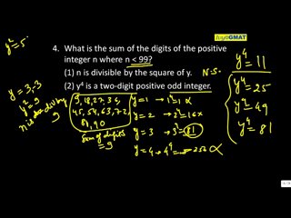 4. What is the sum of the digits of the positive integer n where n < 99? (1) n is divisible by the square of y. (2) y^4 is a two-digit positive odd integer.