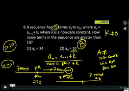 8. A sequence has 15 terms a1 to a15 where an = an–1 + k, where k is a non-zero constant. How many terms in the sequence are greater than 10? (1) a1 = 24 (2) a8 = 10
